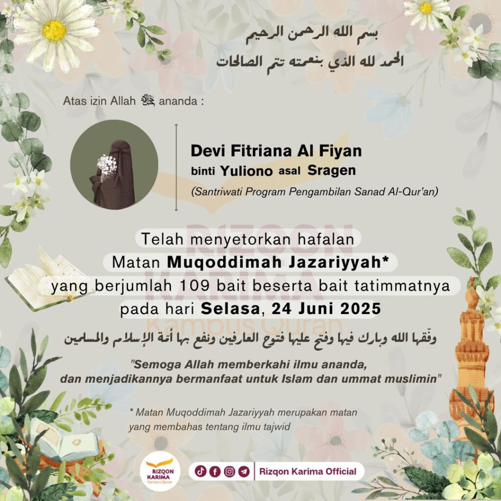 Alhamdulillah ananda 𝗗𝗲𝘃𝗶 𝗙𝗶𝘁𝗿𝗶𝗮𝗻𝗮 𝗔𝗹 𝗙𝗶𝘆𝗮𝗻 binti 𝗬𝘂𝗹𝗶𝗼𝗻𝗼 telah menyetorkan hafalan 𝗠𝗮𝘁𝗮𝗻 𝗠𝘂𝗾𝗼𝗱𝗱𝗶𝗺𝗮𝗵 𝗝𝗮𝘇𝗮𝗿𝗶𝘆𝘆𝗮𝗵 pada hari 𝗦𝗲𝗻𝗶𝗻, 𝟮𝟰 𝗝𝘂𝗻𝗶 𝟮𝟬𝟮𝟱. وفقها الله وبارك فيها وفتح عليها فتوح العارفين ونفع بها أئمة الإسلام والمسلمين Matan Muqoddimah Jazariyyah merupakan matan yang membahas tentang ilmu tajwid