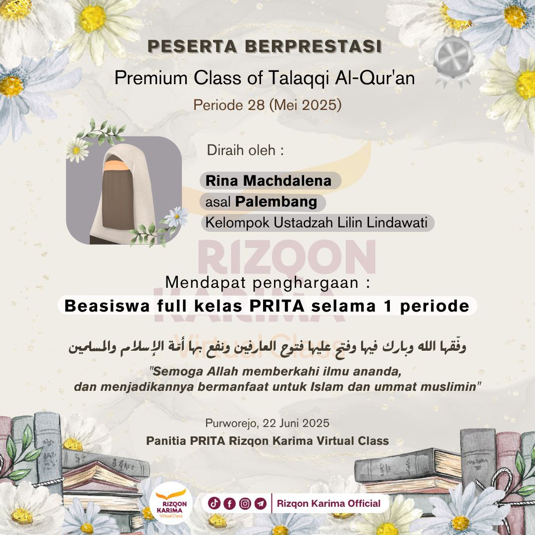 Alhamdulillah pada periode PRITA Silver Bulan Mei 2025 ini Saudari 𝗥𝗶𝗻𝗮 𝗠𝗮𝗰𝗵𝗱𝗮𝗹𝗲𝗻𝗮 asal 𝗣𝗮𝗹𝗲𝗺𝗯𝗮𝗻𝗴 telah terpilih menjadi peserta berprestasi dan berhak mendapatkan beasiswa full kelas PRITA selama satu periode. وفقها الله وبارك فيها وفتح عليها فتوح العارفين ونفع بها أئمة الإسلام والمسلمين