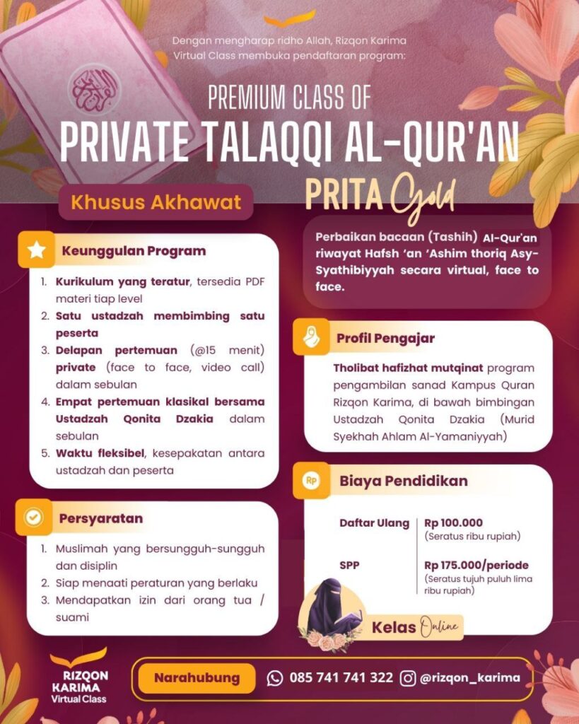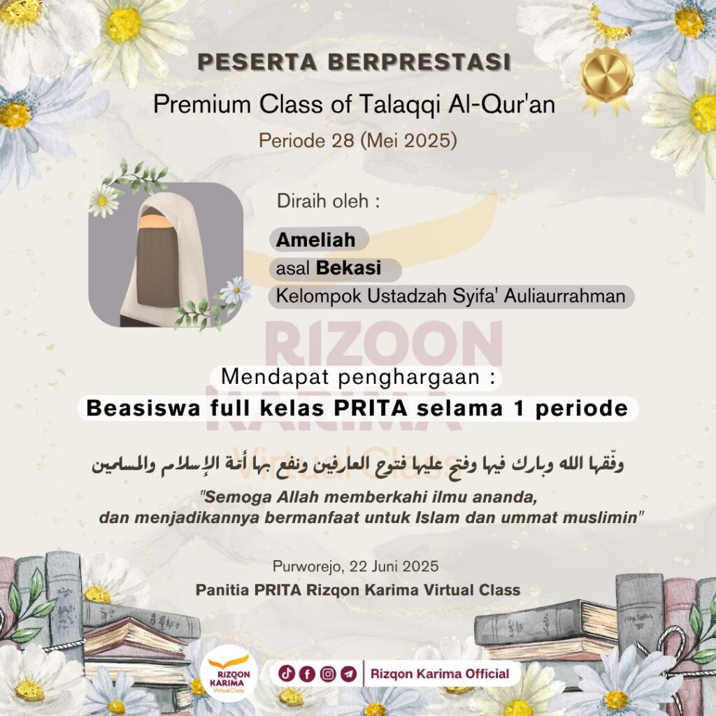 Alhamdulillah pada periode PRITA Gold Bulan Mei 2025 ini saudari 𝗔𝗺𝗲𝗹𝗶𝗮𝗵 asal 𝗕𝗲𝗸𝗮𝘀𝗶 telah terpilih menjadi peserta berprestasi dan berhak mendapatkan beasiswa full kelas PRITA selama satu periode. وفقها الله وبارك فيها وفتح عليها فتوح العارفين ونفع بها أئمة الإسلام والمسلمين