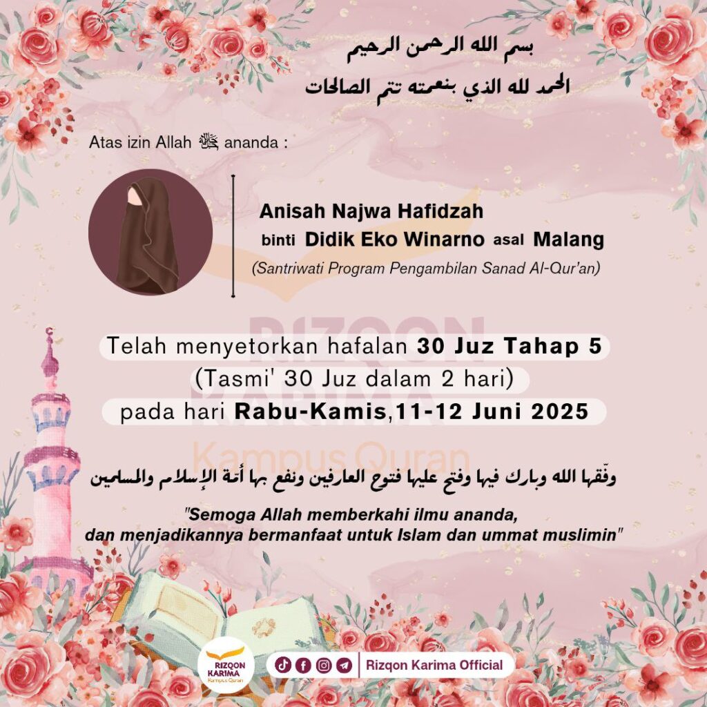 Alhamdulillah Ananda 𝗔𝗻𝗶𝘀𝗮𝗵 𝗡𝗮𝗷𝘄𝗮 𝗛𝗮𝗳𝗶𝗱𝘇𝗮𝗵 telah menyetorkan hafalan 𝗔𝗹-𝗤𝘂𝗿’𝗮𝗻 𝟯𝟬 𝗷𝘂𝘇 𝘁𝗮𝗵𝗮𝗽 𝟱* pada hari Rabu 11 Juni – Kamis 12 Juni 2025. وفقها الله وبارك فيها وفتح عليها فتوح العارفين ونفع بها أئمة الإسلام والمسلمين *𝘛𝘢𝘩𝘢𝘱 5 : 𝘵𝘢𝘴𝘮𝘪’ 30 𝘫𝘶𝘻 𝘥𝘢𝘭𝘢𝘮 2 𝘩𝘢𝘳𝘪 (15 𝘫𝘶𝘻 𝘱𝘦𝘳 𝘩𝘢𝘳𝘪)