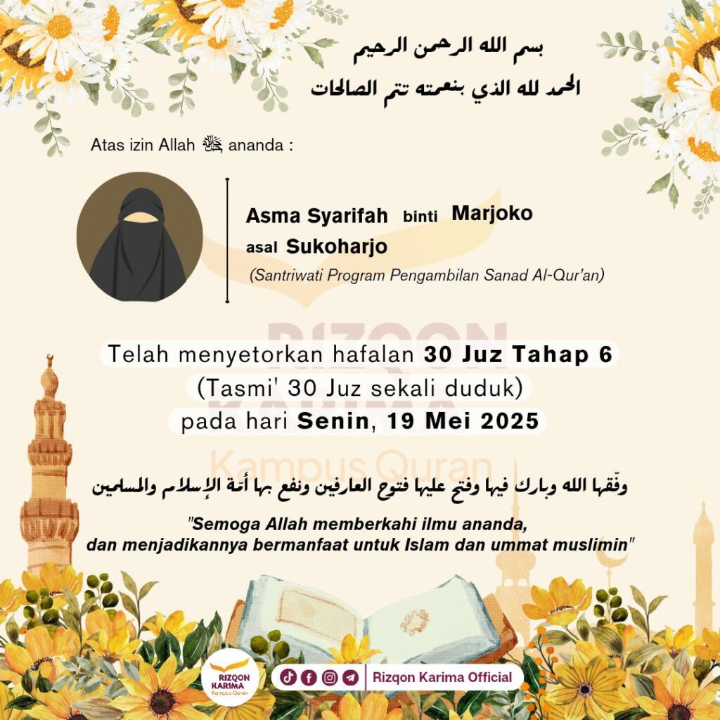Alhamdulillah ananda 𝗔𝘀𝗺𝗮 𝗦𝘆𝗮𝗿𝗶𝗳𝗮𝗵 𝗯𝗶𝗻𝘁𝗶 𝗠𝗮𝗿𝗷𝗼𝗸𝗼 telah menyetorkan hafalan 𝗔𝗹-𝗤𝘂𝗿’𝗮𝗻 𝟯𝟬 𝗷𝘂𝘇 𝘁𝗮𝗵𝗮𝗽 𝟲* pada hari Senin, 19 Mei 2025. وفقها الله وبارك فيها وفتح عليها فتوح العارفين ونفع بها أئمة الإسلام والمسلمين. *𝘛𝘢𝘩𝘢𝘱 6 : 𝘵𝘢𝘴𝘮𝘪’ 30 𝘫𝘶𝘻 𝘥𝘢𝘭𝘢𝘮 𝘴𝘦𝘬𝘢𝘭𝘪 𝘥𝘶𝘥𝘶𝘬 (1 𝘩𝘢𝘳𝘪)