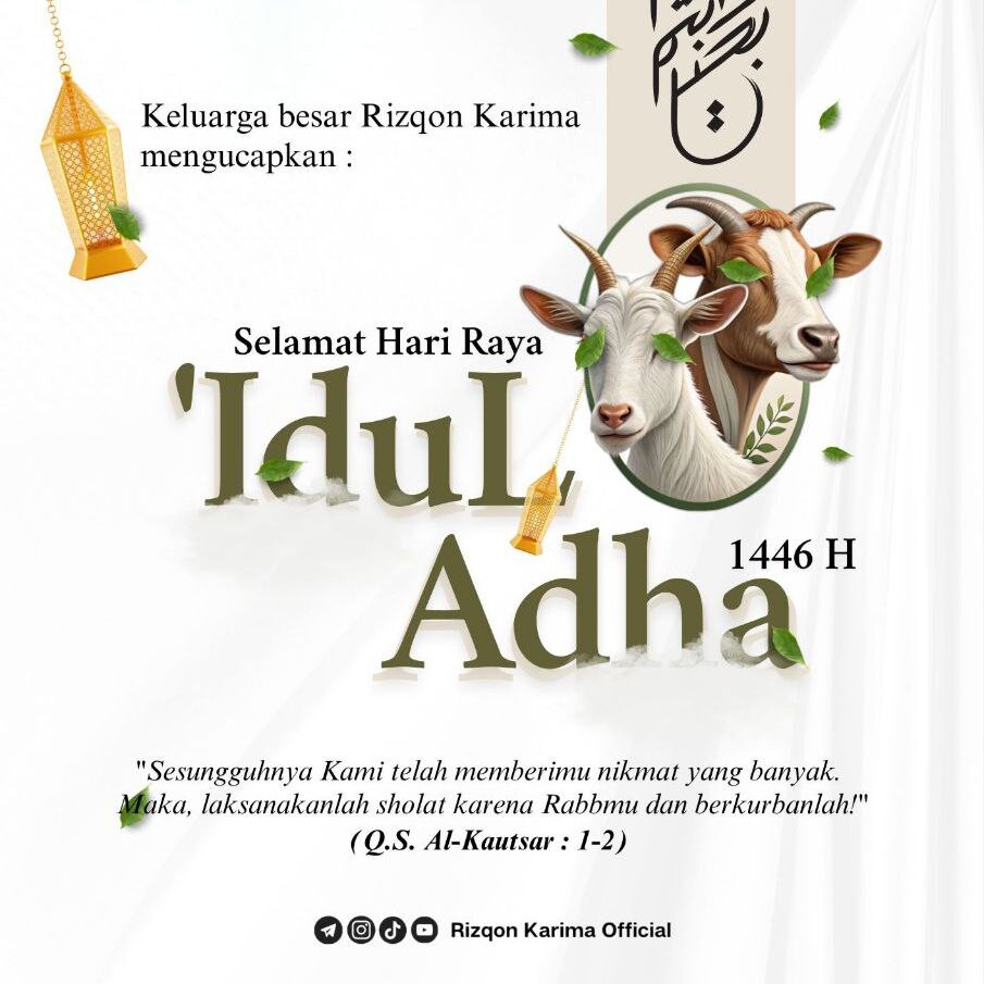 ◦•●◉✿ ✿◉●•◦ ◦•●◉✿ ✿◉●•◦ Keluarga besar 𝗥𝗶𝘇𝗾𝗼𝗻 𝗞𝗮𝗿𝗶𝗺𝗮 mengucapkan : 𝐒𝐞𝐥𝐚𝐦𝐚𝐭 𝐇𝐚𝐫𝐢 𝐑𝐚𝐲𝐚 𝐈𝐝𝐮𝐥 𝐀𝐝𝐡𝐚 𝟏𝟒𝟒𝟔 𝐇 “Sesungguhnya Kami telah memberikan kepadamu nikmat yang banyak. Maka, laksanakanlah shalat karena Tuhanmu dan berkurbanlah!” (Q.S. Al-Kautsar : 1-2) ◦•●◉✿ ✿◉●•◦ ◦•●◉✿ ✿◉●•◦