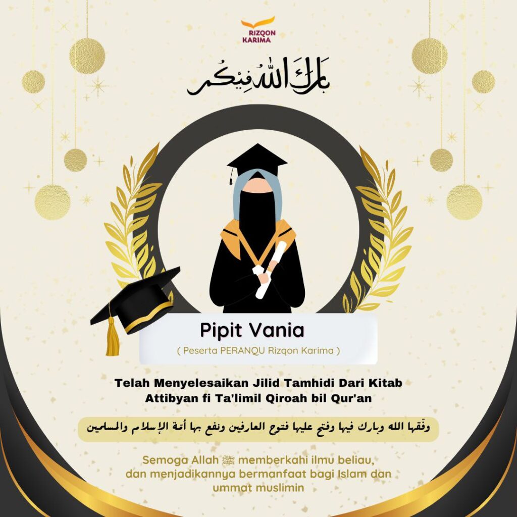 Alhamdulillah, saudari 𝗣𝗶𝗽𝗶𝘁 𝗩𝗮𝗻𝗶𝗮, peserta kelas PERANQU Kampus Quran Rizqon Karima telah menyelesaikan 𝗝𝗶𝗹𝗶𝗱 𝗧𝗮𝗺𝗵𝗶𝗱𝗶 dari Kitab 𝗔𝘁-𝗧𝗶𝗯𝘆𝗮𝗻 𝗳𝗶 𝗧𝗮’𝗹𝗶𝗺𝗶𝗹 𝗤𝗶𝗿𝗼𝗮𝗵 𝗯𝗶𝗹 𝗤𝘂𝗿’𝗮𝗻. وفقها الله وبارك فيها وفتح عليها فتوح العارفين ونفع بها أئمة الإسلام والمسلمين